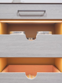 Functional hardware refers to the necessary component parts that enable the many functions of cabinetry and provide practical utility to the system as a whole. Door hinges, drawer slides, shelf pins, and LED lighting are examples.